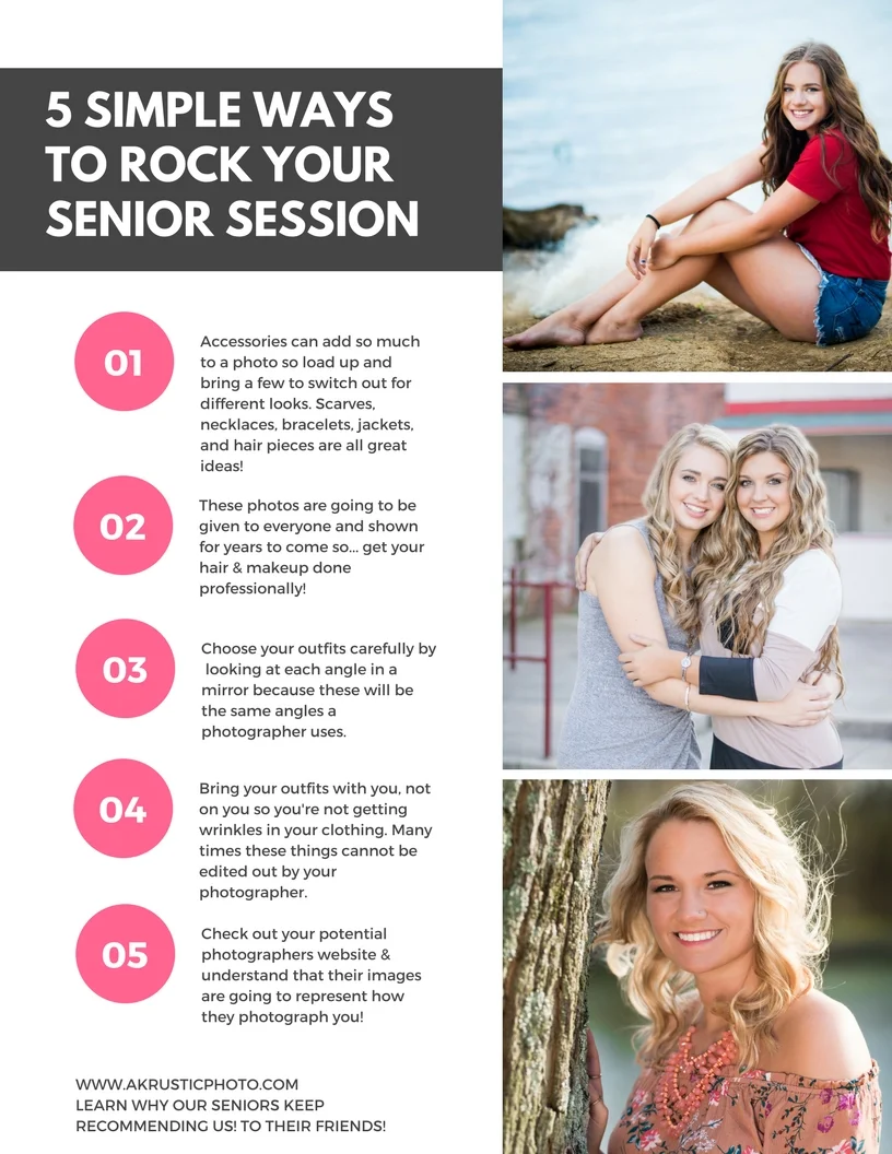 Here are just a few tips on how to make the most out of your senior session. Don't forget to share this out with a senior that you know and check out what makes our senior experience unique and something local seniors want to be apart of!