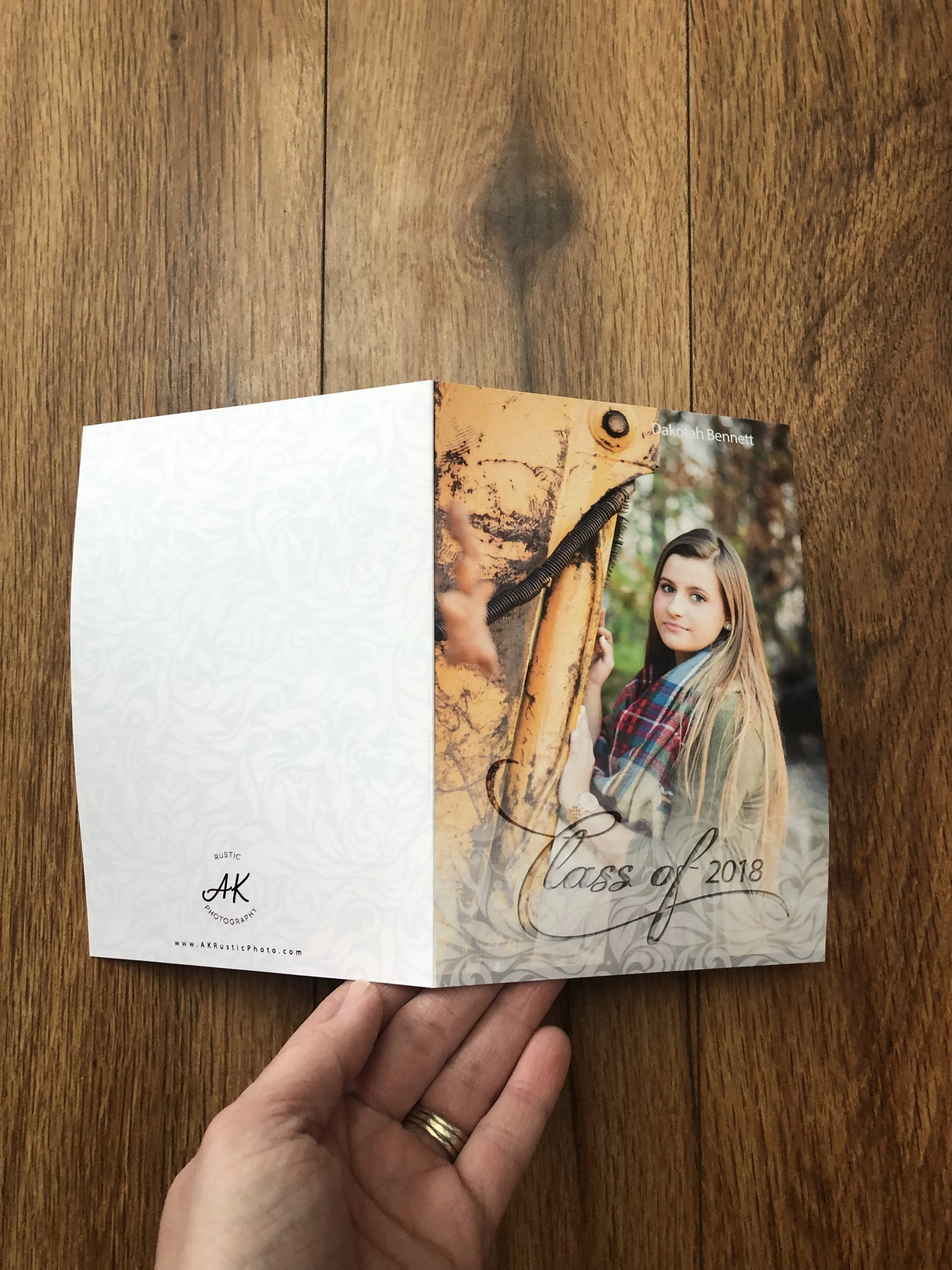 Double sided wallets can have names, year graduation or other words at the corner of any side. This particular photos we just did her name on one side. Double sided wallets come in sets of 50 only.